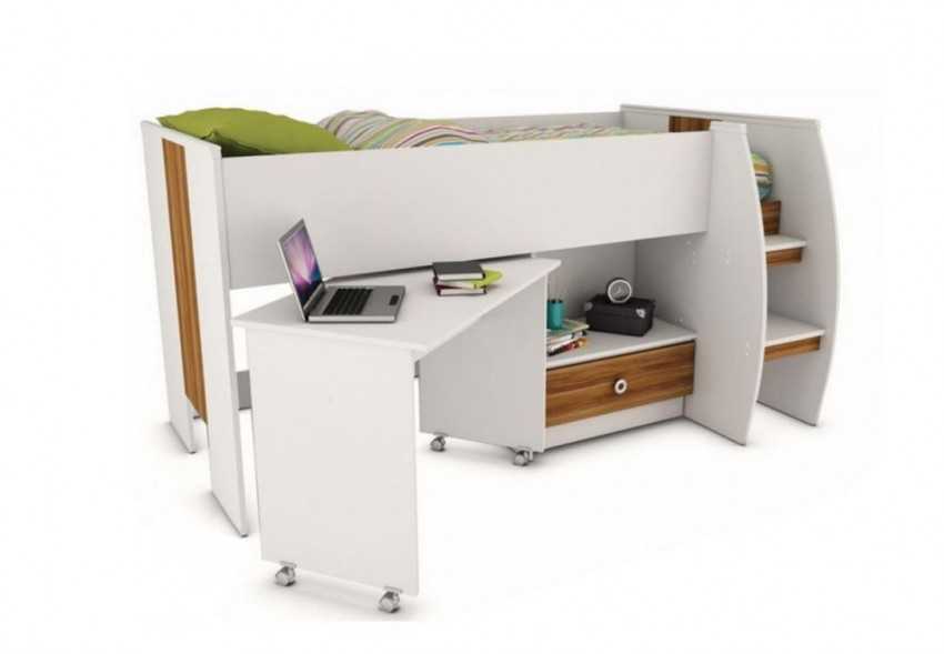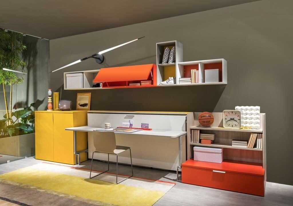 Наглядный пример: откидная кровать со столом. В дневное время ложе устанавливается вертикально и выглядит как обычный шкаф. Перед сном столешница со всем содержимым может подниматься или опускаться. Еще один вариант — конструкция, дополненная поворотным механизмом. С одной стороны располагаются полки, а с другой матрас с выдвигающимися ножками.
