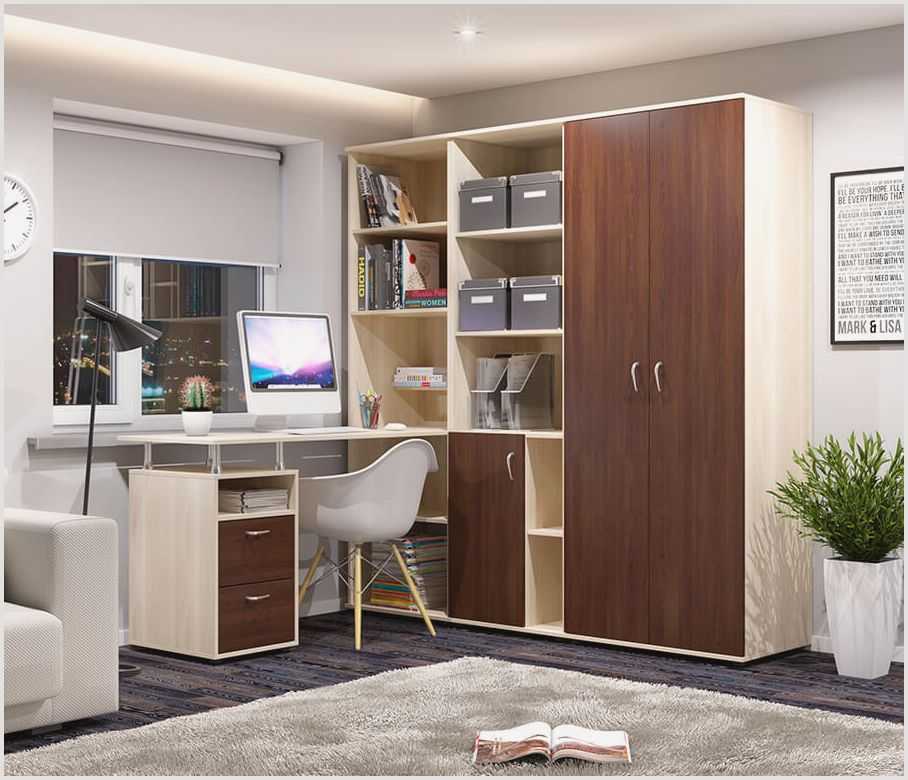 Мебель, состоящая из стола и стеллажа, уместна в разных по назначению помещениях.