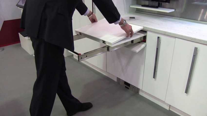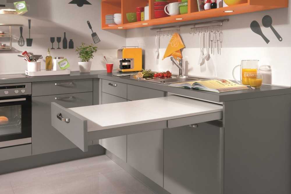 - Действует как дополнительная столешница, на которой удобно нарезать продукты, либо расположить электрические приборы (комбайн, миксер).