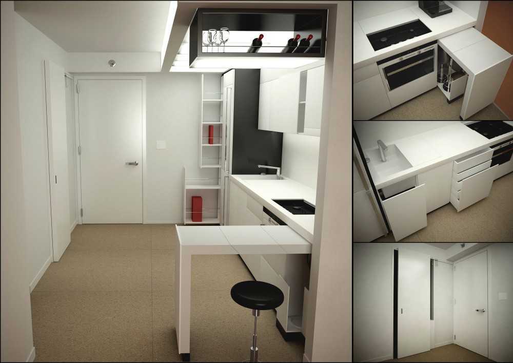Данная система, кроме визуального увеличения комнаты, ещё и добавляет свободное пространство для работы. Конструкция без особых усилий “превращается” в небольшую сервировочную поверхность, которая достаточно устойчива.