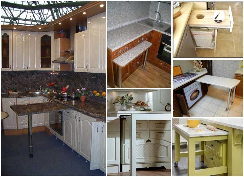 Обычно столешница выдвигается из нижнего ящичка тумбочки, под основной поверхностью. Но можно встретить ряд моделей, которые расположены наравне с основной обеденной площадью.
