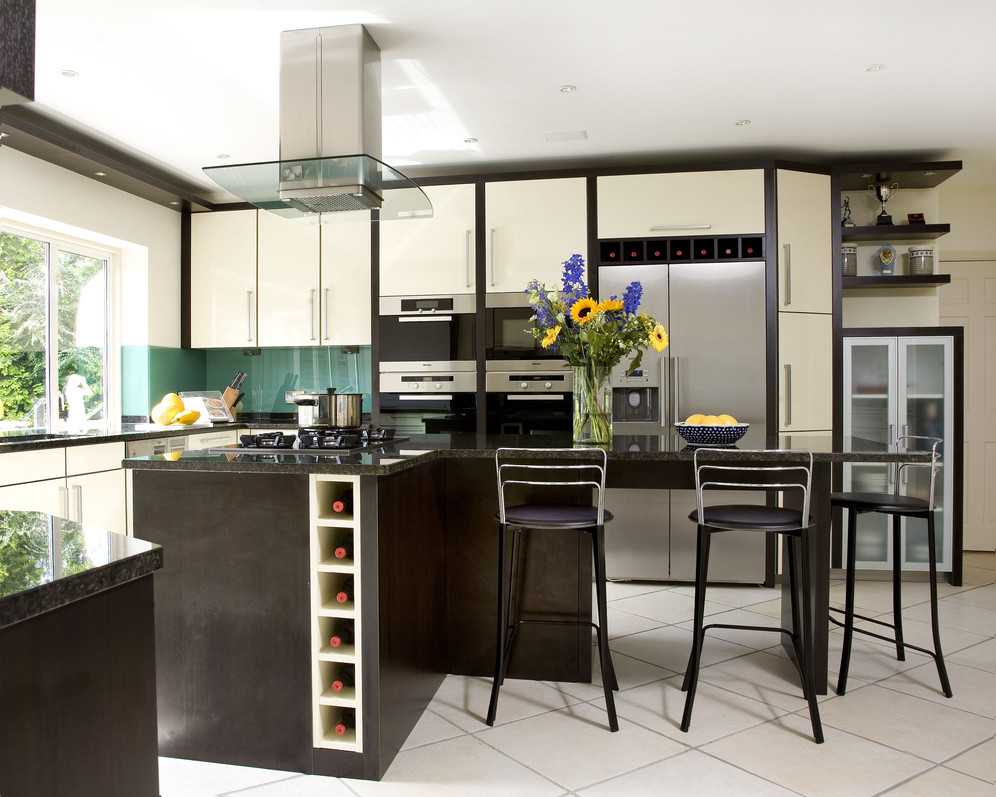 Ажурные модели необычных форм и темных оттенков станут прекрасным дополнением металлического блестящего стола в условиях черно-белой кухни.