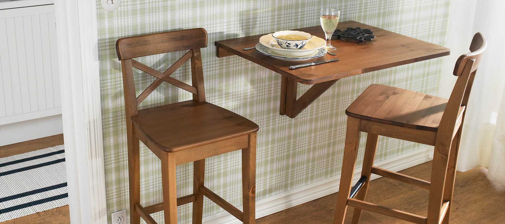 Например, стулья и кресла для улицы (веранда, балкон, кафе) должны быть легкими и в то же время прочными: для этих целей у Ikea есть множество вариантов складных и штабелируемых стульев («Фейян», «Терье», «Свен-Бэртиль», «Икеа ПС 2012»). А вот для кухни (и не только) есть очень интересный вариант – складная стремянка Бэквем: в качестве лестницы она пригодится в поиске нужного ингредиента в дальних шкафчиках, или можно будет использовать как высокий табурет, или как подставку для цветов. А когда нужно будет ее убрать, Вы просто можете ее сложить и повесить на стену для экономии пространства, и в комплекте уже есть настенное крепление.
