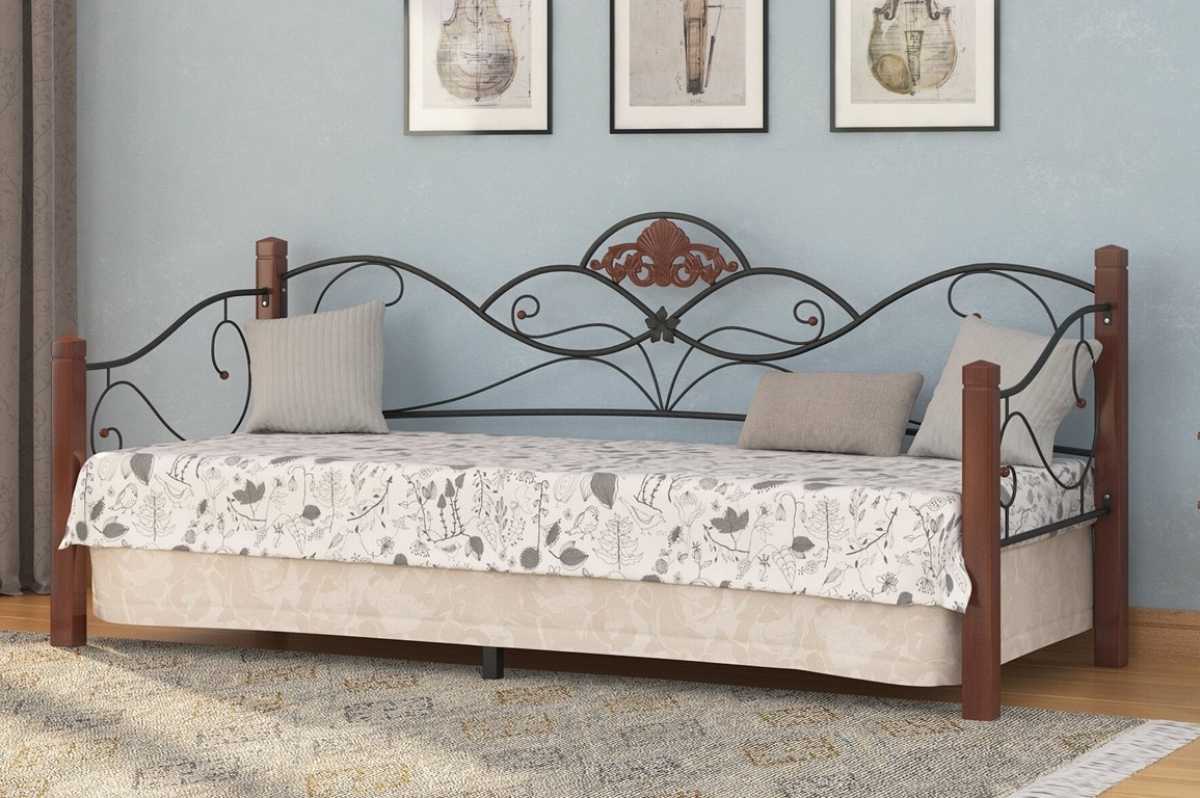 - Металлическая кушетка. Такой вариант встречается довольно редко. Но при этом он может стать хорошей альтернативой для мебели из дерева. От качества металла зависит устойчивость конструкции, а сама технология позволяет встраивать в тахту раздвижной механизм. Преимущество: сравнительно недорогая цена.