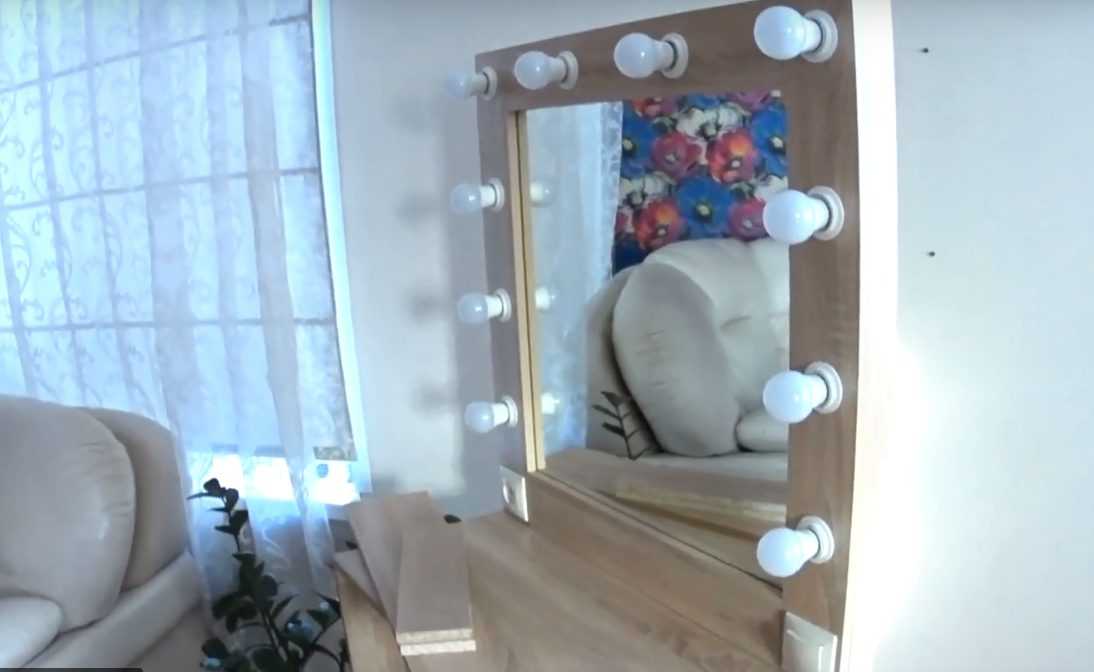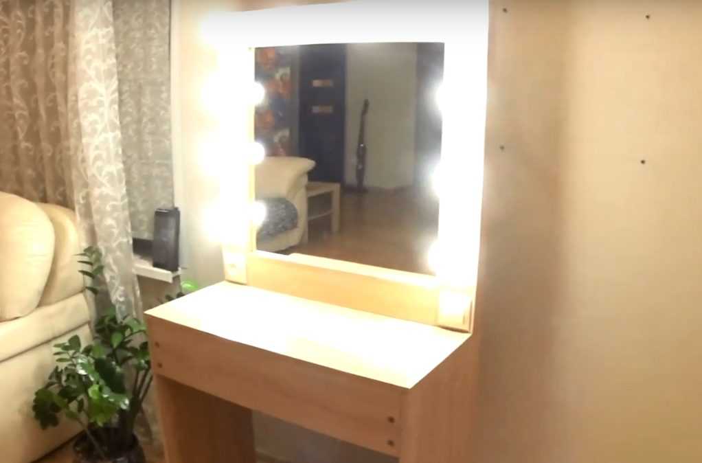 При удаленном расположении от окон светодиодного освещения недостаточно. Лампы дневного света или другие светильники фиксируются к столику с помощью саморезов или жидких гвоздей, чаще всего сверху или по боковому периметру зеркала. Отверстия под провода для их питания подготавливаются в корпусе заранее.