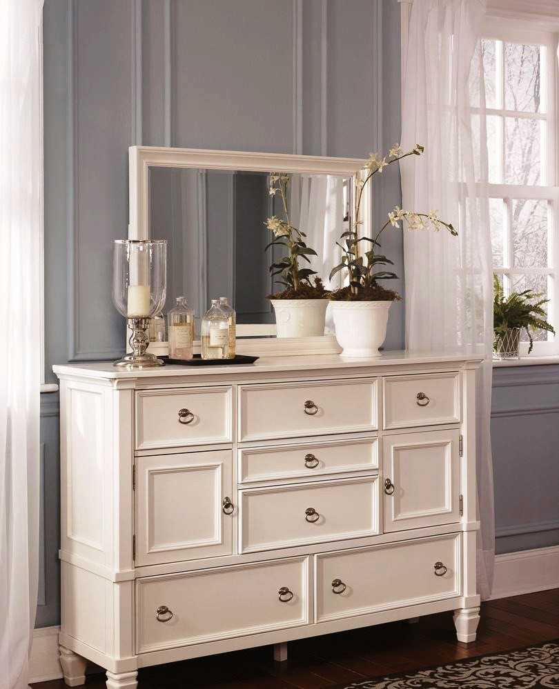 - Универсальность белого комода дает ему возможность выполнять несколько функций: место для хранения одежды, белья и туалетный столик, если сверху повесить зеркало. Если в доме новорожденный, комод можно дополнить бортиками, и он превратится удобный столик для пеленания.