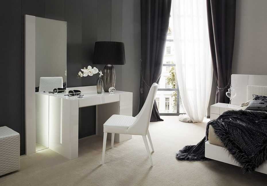 Любой девушке нужно личное пространство, в котором она может хранить косметические принадлежности, выполнять повседневный и выходной мейк-ап. Для просторного помещения спальной комнаты будет украшением размещение дамского столика с зеркалом. Дополнить его при необходимости следует подсветкой. Модельный ряд изделий достаточно широк, можно выбрать идеальное решение для обустройства женской территории.