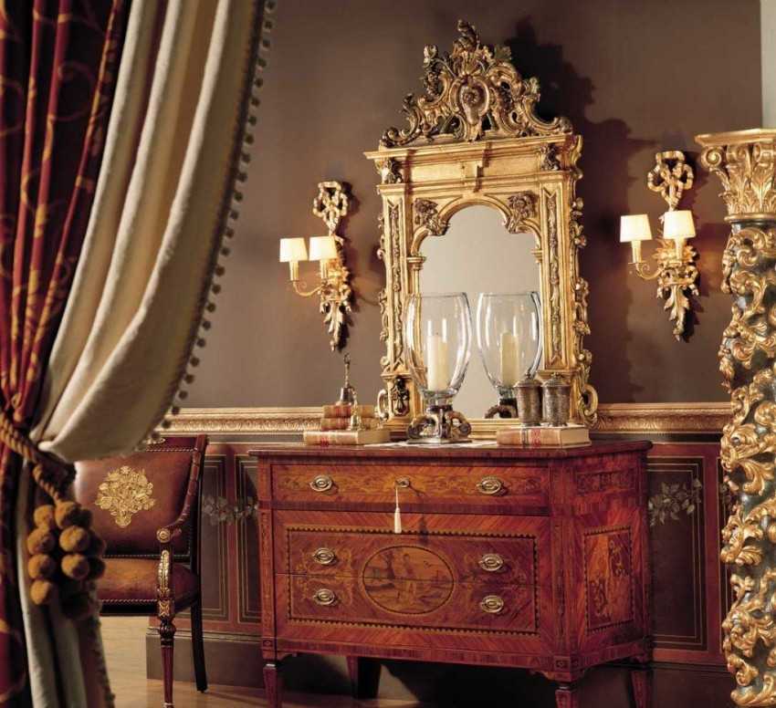Декор с использованием позолоты, серебристых и бронзовых оттенков подойдет для барокко или ампира. В комнате с классическим оформлением также можно использовать для трюмо такие тона, но не злоупотреблять ими. Противопоказана позолота для спальни прованс.