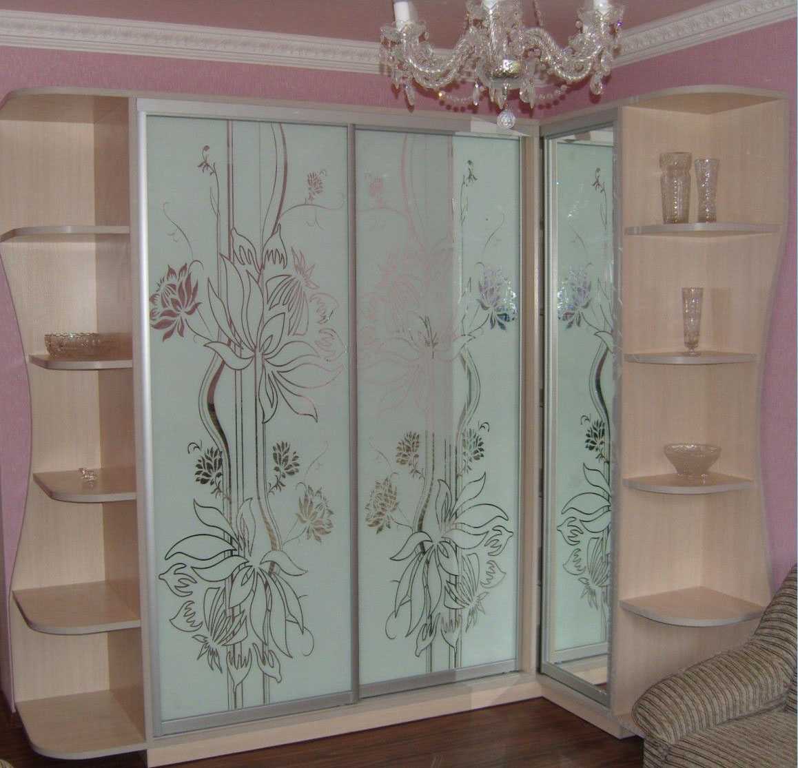 При разработке схемы сборки углового шкафа учитываются особенности фасада. Конструкция может быть открытого либо закрытого типа с дверьми типа купе. Двери могут быть оформлены зеркальными вставками, росписью, гравировкой, резьбой, декоративной мозаикой. Фасады можно оклеивать декоративной оттеночной пленкой, демпферной лентой, металлическими вставками.