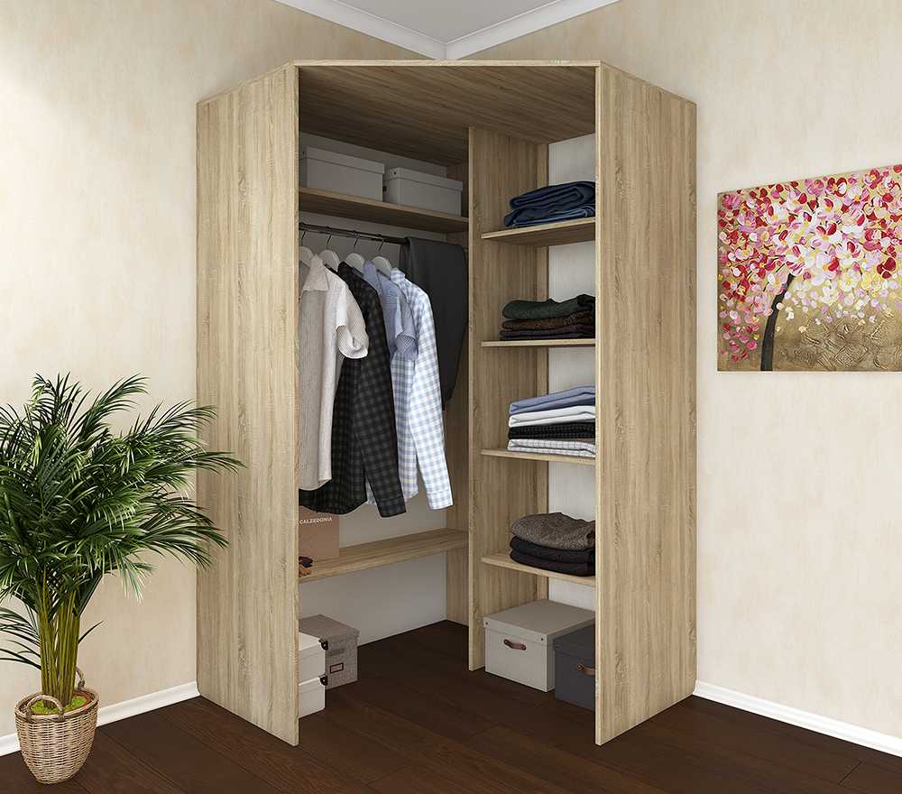 Размеры шкафа рассчитываются, исходя из возможностей пространства. Минимально возможной считается конструкция, занимающая 600˟600 мм от угла. Для достаточной ширины фасада (не менее 400 мм) глубина боковин не должна превышать 300 мм. Такой миниатюрный шкаф сопоставим по габаритам с навесным кухонным модулем и может быть оборудован только крючками для одежды и полками. Штанга в него уже не поместится.