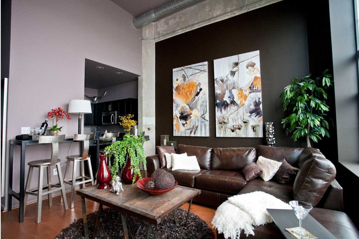 Если комната оформлена в пастельных тонах, подойдет диван коричневого оттенка.