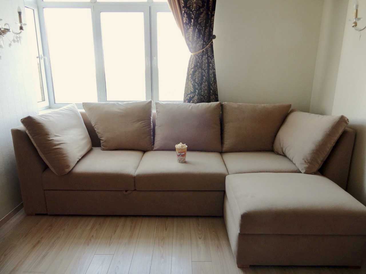 Само изделие представляет собой небольшую компактную конструкцию, но спальное место получается большим. Такой угловой диван легко впишется в интерьер маленькой гостиной. Недостаток: вся конструкция держится на петлях, которые со временем могут расшататься и выйти из каркаса. Еще один минус – отсутствие изголовья у спального места. Диван раскладывается достаточно тяжело.