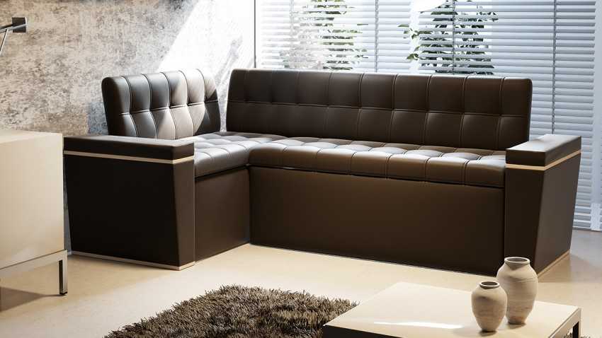 Кожзаменитель или натуральная кожа – такой вид выглядит презентабельно. Его можно поставить в гостиной, имеющей оформление в современном стиле или хай-тек, а также в кабинете. В кухонной зоне эту часть интерьера будет легко мыть, очищать от пятен.