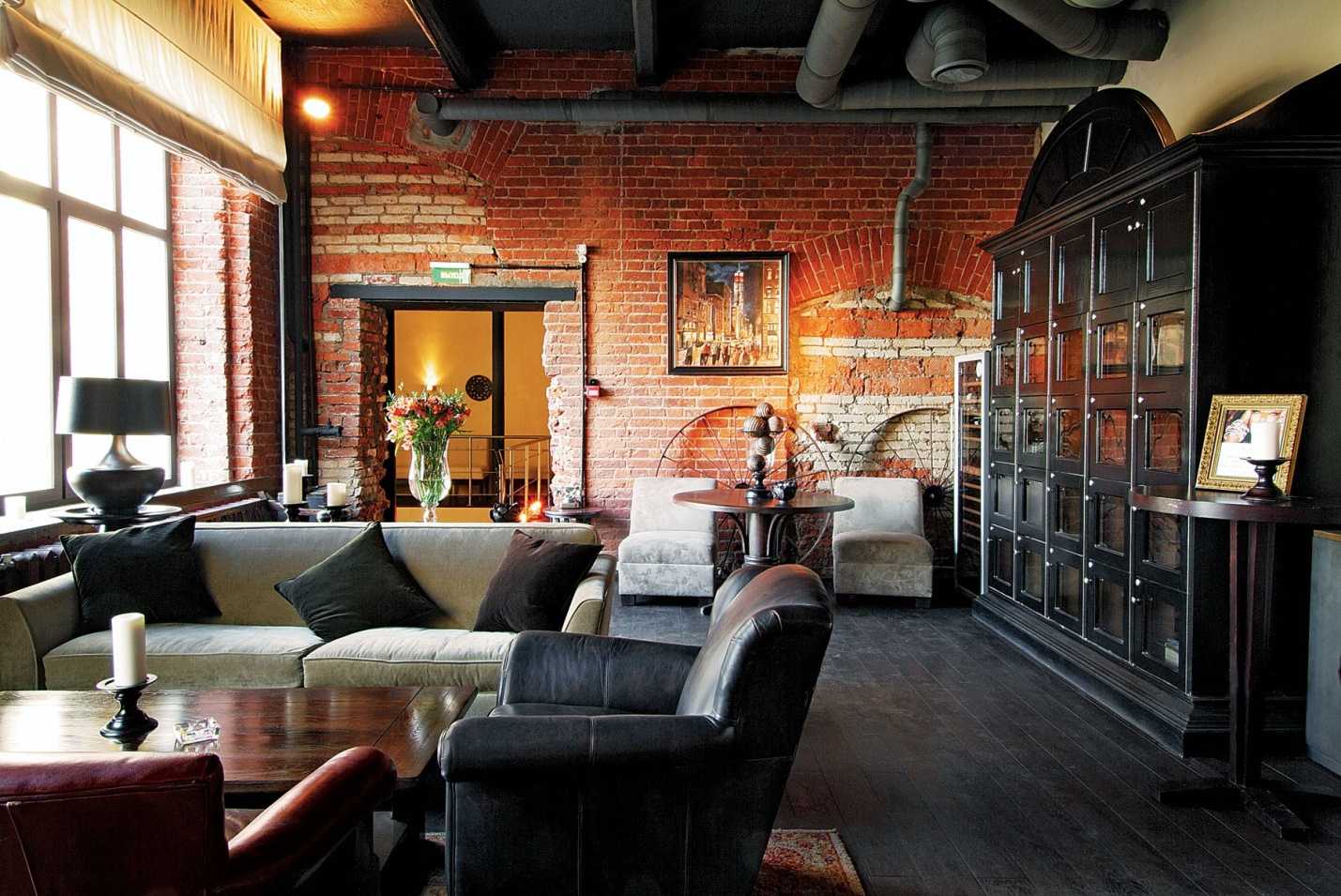 Кому-то приглянется брутальный вариант – гостиная в стиле лофт. Здесь книжный «монстр» «врастает» в чёрные доски всей своей такой же чёрной массой, мрачно поблёскивая стёклами створок, за которыми надёжно укрылись книги.