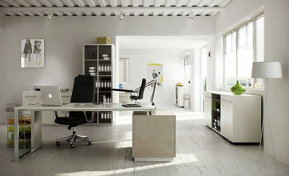 Для офисных пространств хорошо подходит стиль хай-тек, достаточно лаконичный и деловой. И всё же здесь нашлось место застеклённому пеналу для книг и папок с документами.