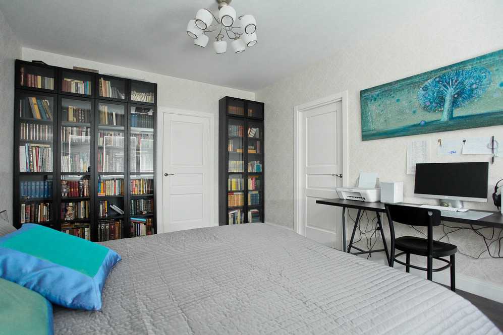 И в крошечной спальне нашлось место для встроенного книжного гардероба с раздвижными стеклянными дверями-купе и антресолью над входом. Весьма экономное размещение довольно крупного собрания книг в небольшом пространстве комнаты.