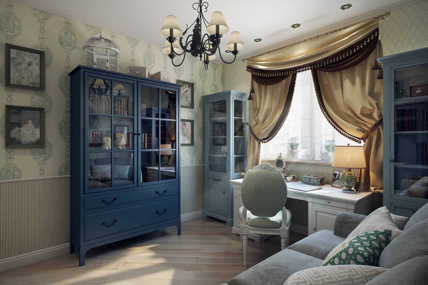 А это уже другой кабинет, более женственный, в стиле прованс. Здесь книги спрятаны за стёклами в небольшом синем двустворчатом шкафу с нижними ящиками. Благодаря невысоким ножкам при всей своей приземистости он обретает некоторую воздушность и выглядит естественным и изящным дополнением обстановки, избавляя от налёта будуарности.