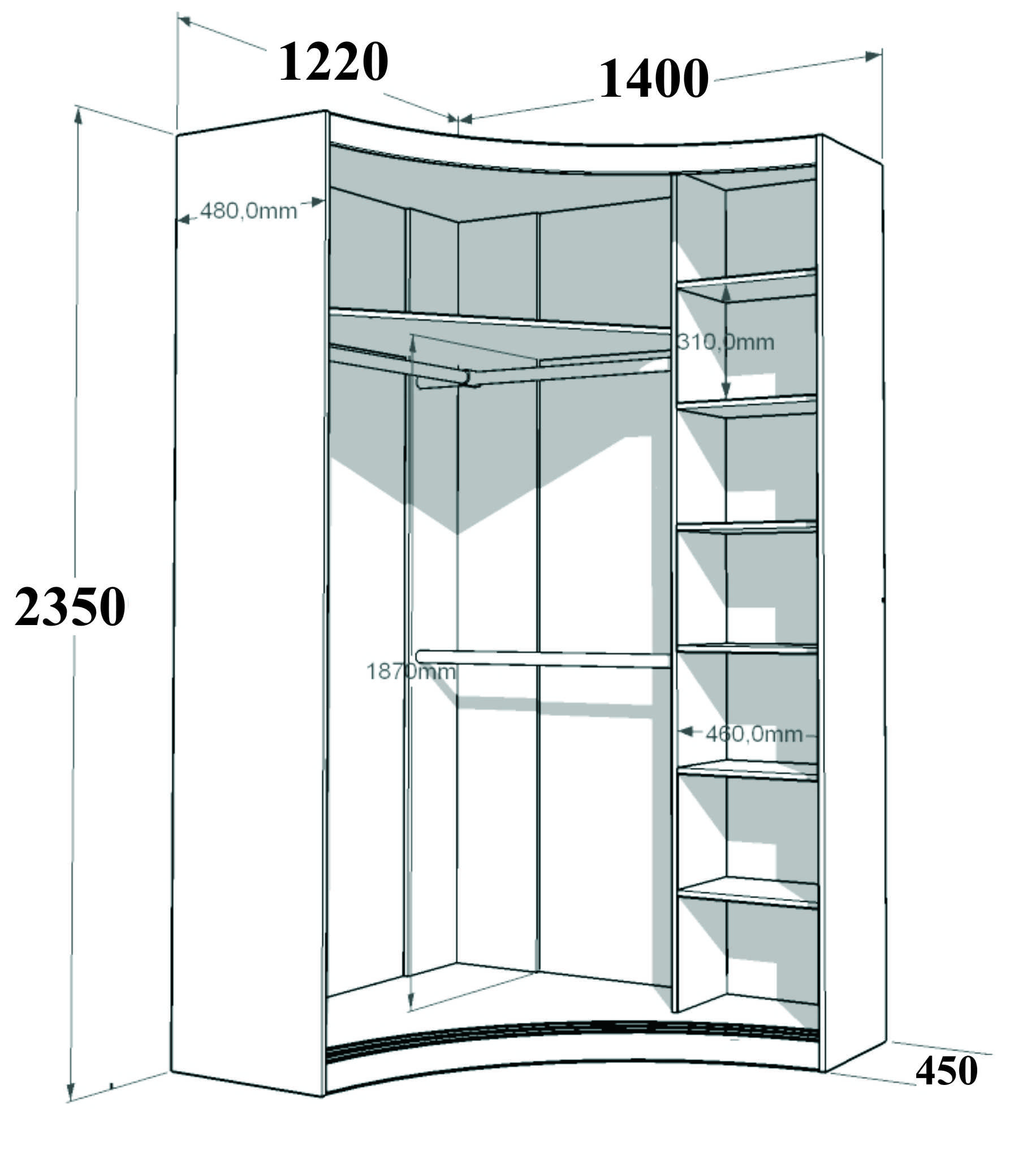 Средние размеры небольших сегментов: ширина (от угла вдоль стены) 950 мм, 1250 мм. В этом случае рационально использовать радиусные двери с выпуклой поверхностью. Если угловой модуль является переходным, то есть к нему будут монтироваться прямоугольные секции, то оптимальная ширина приставной части (боковой стенки) 450 мм, 600 мм. В этом случае можно сформировать пространство для вещей, которые вешаются на плечики.