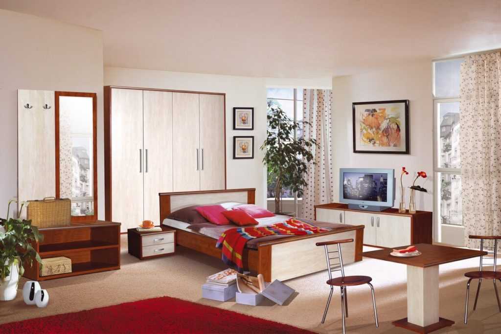 Для того чтобы спальня с маленькой площадью была функциональной, но не захламленной в нее можно установить шкаф с корпусной конструкцией. Главное правильно ее подобрать, чтобы она вписывалась в помещение.