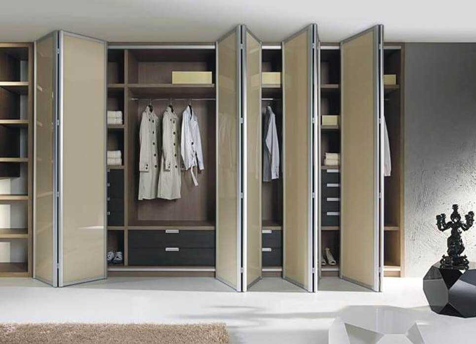 Благодаря особой конструкции дверных полотен, шкафы со сдвижными системами лишены недостатка раздвижных механизмов. Сложенное гармошкой дверное полотно не перекрывает доступ к внутреннему наполнению. Ключевой недостаток складных фасадов — нестабильность дверного полотна, вследствие отсутствия нижней направляющей.