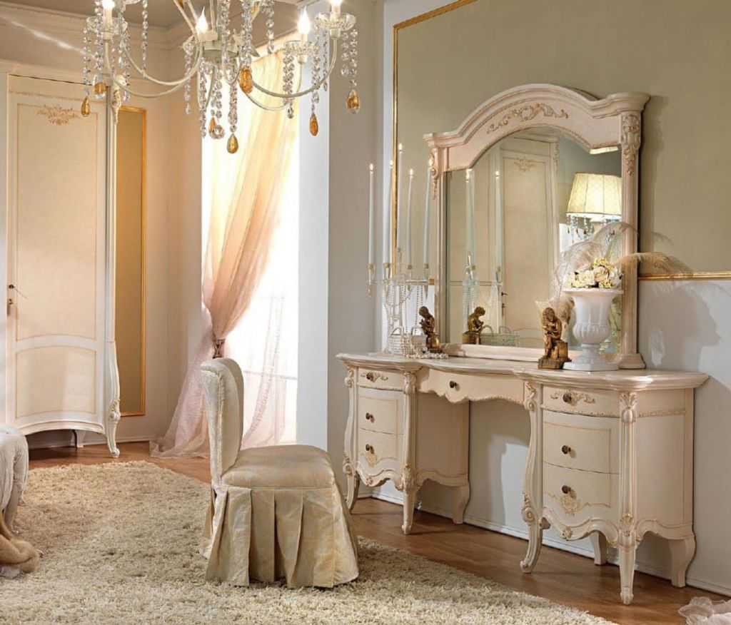 Для спальни в стиле барокко или ампир характерны элементы роскоши. Столик здесь должен иметь резные элементы или лепину, отделку бронзой или позолотой.