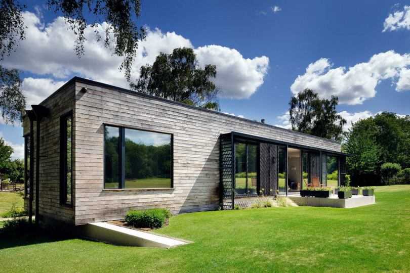 - Универсальный вид вписывает дом в любой ландшафт – в лес, в сад, в сельскую местность, в частный сектор. Он будет выглядеть контрастно по сравнению с обычными зданиями и гармонировать с природными элементами