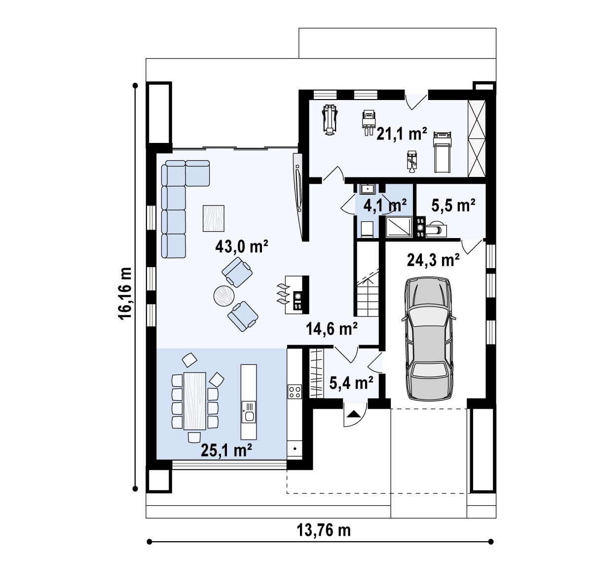 Отличный вариант дома для тех, кто любит все современное, продуманное и комфортное. Главная особенность дома – наличие гаража и подсобных помещений. Кроме этого, на первом этаже предусмотрено помещение для организации спортивной зоны. Из импровизированного спортзала есть выход на улицу, а если организовать во дворе бассейн, то после тренировок сразу можно купаться. Также на первом этаже расположилась просторная гостиная с остеклением в пол. Дополнит интерьер гостиной зоны камин. Кухня-столовая расположена рядом с гостиной и отделена от нее только лишь визуальным зонированием – никаких перегородок. Для удобства жильцов на первом этаже расположен санузел, а все жилые комнаты вынесены на второй этаж.