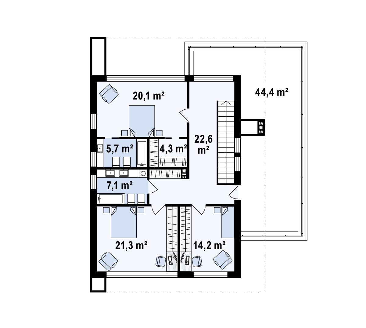 Проектом предусмотрено расположение на втором этаже трех спальных комнат. В одной из них есть отдельная кладовка и свой санузел. Также на втором этаже располагается еще один санузел для тех, кто будет отдыхать в двух других спальнях. С коридора второго этажа есть выход на просторную остекленную зону, которую можно превратить в уютную комнату отдыха с шикарным видом. Площадь дома 236 м2.