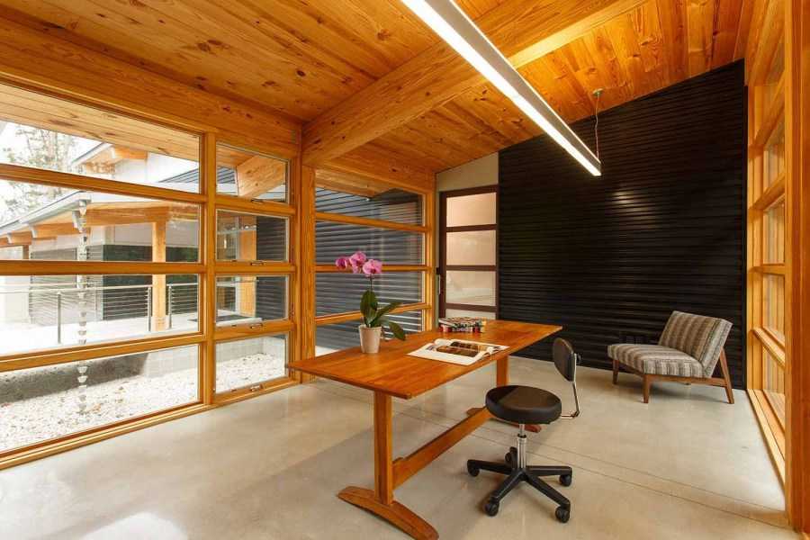Дома из бруса с односкатной кровлей очень тёплые и надёжные. Благодаря одинаковому материалу несущих конструкций стен и крыши такие здания крепкие и экологичные. Кровельные балки зачастую делают большого сечения, что увеличивает прочность конструкции и добавляет интерьеру выразительности. Такая кровля может выдержать зимой снежную шапку, которая будет является природным утеплителем.