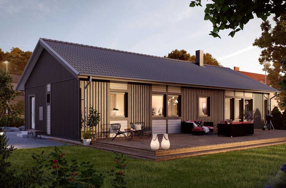 Фишка проекта – большая кухня-гостиная с камином, поэтому прохладными зимними вечерами можно будет коротать время у огня в уютном семейном кругу. Из гостиной-столовой можно легко попасть на крытую террасу, площадь которой составляет около 30 м2. Тут достаточно места, чтобы организовать праздник на свежем воздухе. В теплое время года все обеды вообще можно проводить на террасе – перенести все приборы и блюда будет легко, ведь кухня находится рядом. Еще один бонус – печь на террасе, поэтому вопрос с приготовлением шашлыков в таком доме будет полностью решен. Наличие навеса позволит проводить пикники в любую погоду. В итоге получаем отличный компактный и очень продуманный дом.