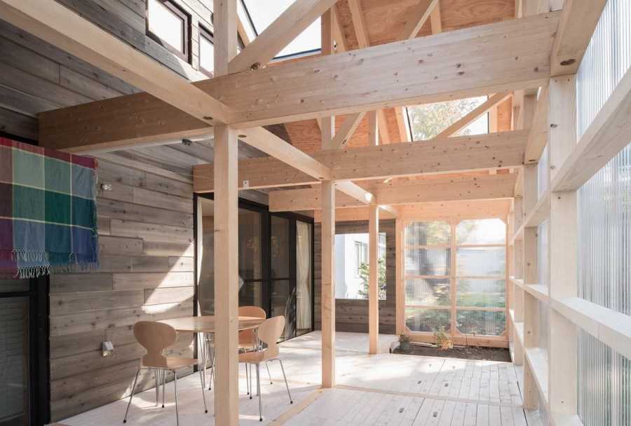 Мощные кровельные балки, которые перекрывают весь дом по ширине, организуют навес с дворового фасада