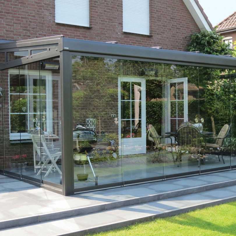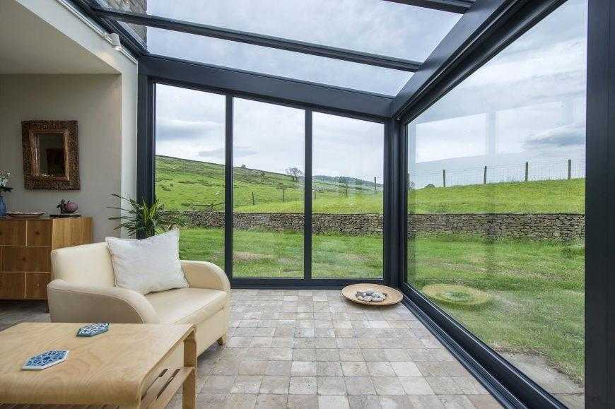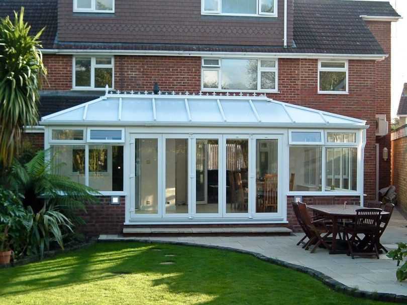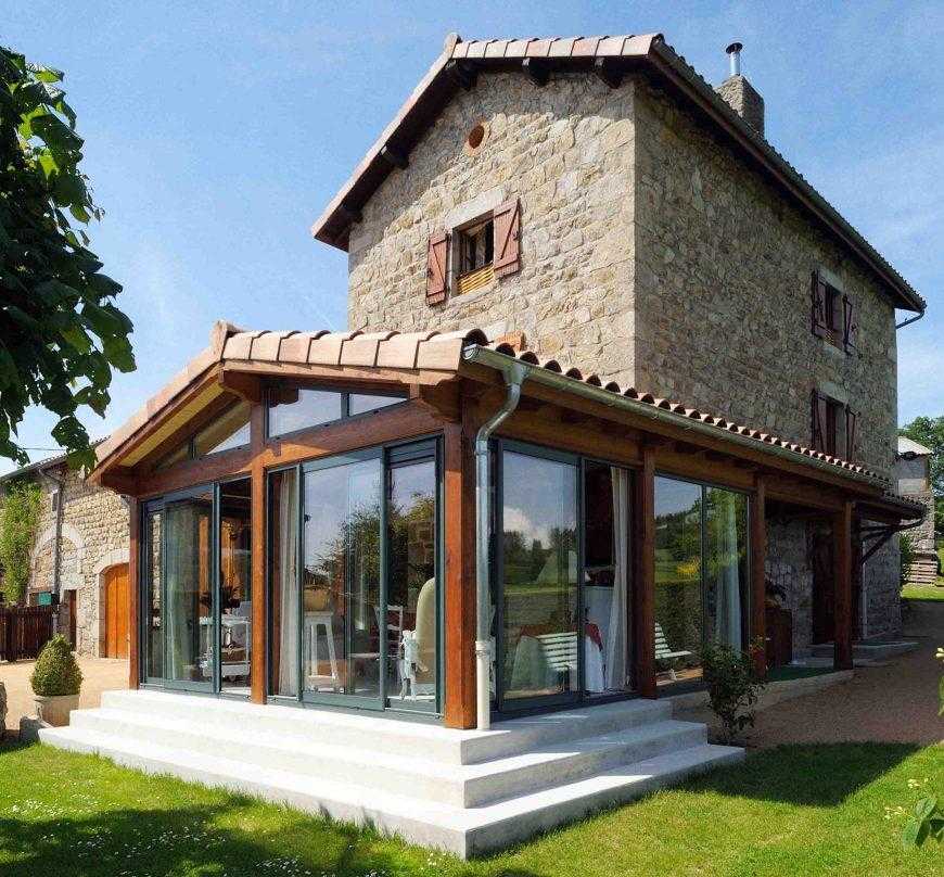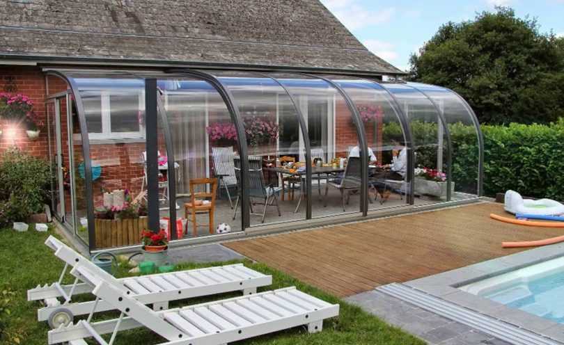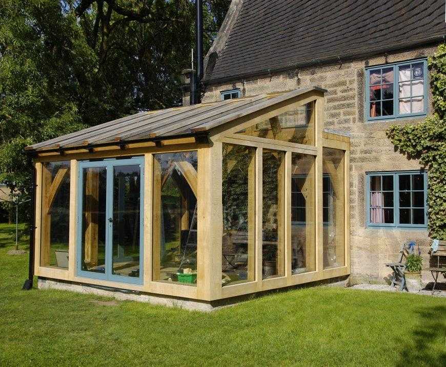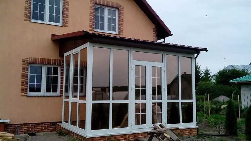 - Закрытая остекленная. Дерево используется только в качестве каркаса, а стены заменены французскими окнами (в пол). Для жилья такое помещение вряд ли будет пригодно, так как здесь будут высокие тепловые потери. Оптимальное решение для создания зимнего сада или овощного склада.