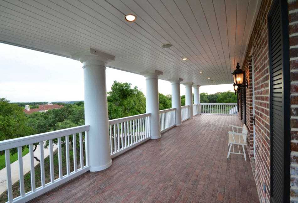 Столбчатый фундамент приветствует легкая открытая веранда. Также столбы под верандой можно устраивать, если дом имеет выступающий над грунтом цокольный этаж. В этом случае, перед входом находятся ступени.
