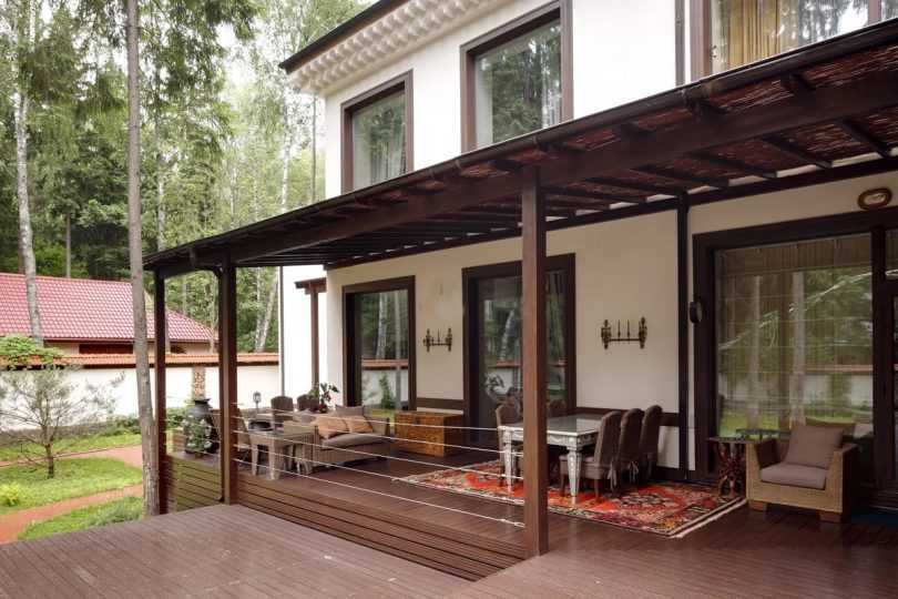 В обоих случаях предполагается устройство отдельной или общей с домом крыши, которая защитит веранду из бруса от непогоды. Террасы же обычно делают по каркасной технологии, причем каркас используется только для возведения крыши и устройства полов и ограждения.