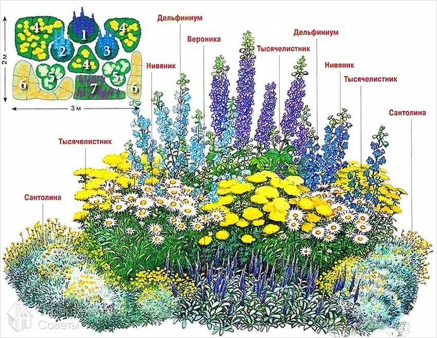 Подбираются цветы не только по высоте, но и по периодам цветения. В каждом ярусе должны присутствовать растения, цветущие в разное время года. Это обеспечит нарядность цветника в течение всего сезона.