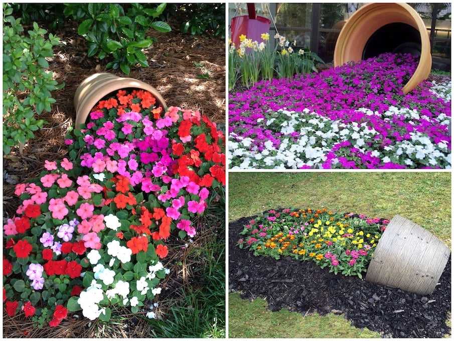 Идеи для дачи – не должны быть чем-то ограничены. Создавать в саду красивые арт-объекты можно абсолютно из чего угодно. Удивительный по декору цветочный ручей получается, если положить на бок бочку кадку или другую вместительную емкость с почвой на землю и насыпать извилистой линией слой грунта. После посадки низкорослых цветущих растений постепенно образуется колоритный яркий акцент.