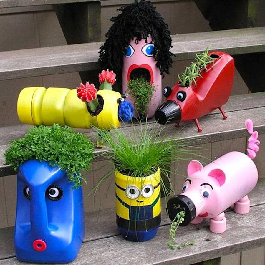 Большие бутылки из-под воды можно использовать как оригинальные клумбы в виде поросенка. Для этого обрезается боковина бутылки — там будут расти цветы. Потом из оставшейся боковины вырезаются уши.