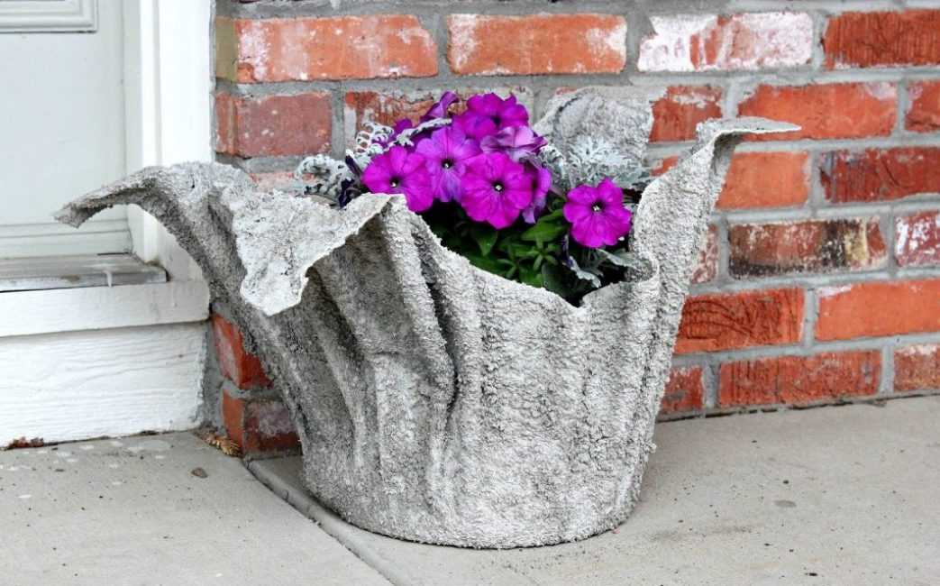 Невзрачный сам по себе, но удивительно удобный в работе материал – бетон. Он обладает прочностью камня, поэтому отливка может прослужить очень долго. Доступность и относительная дешевизна компонентов раствора делает бетон особенно желанным для тех, кто хочет создавать вазоны для цветов своими руками.
