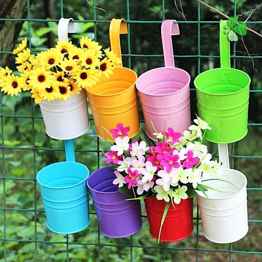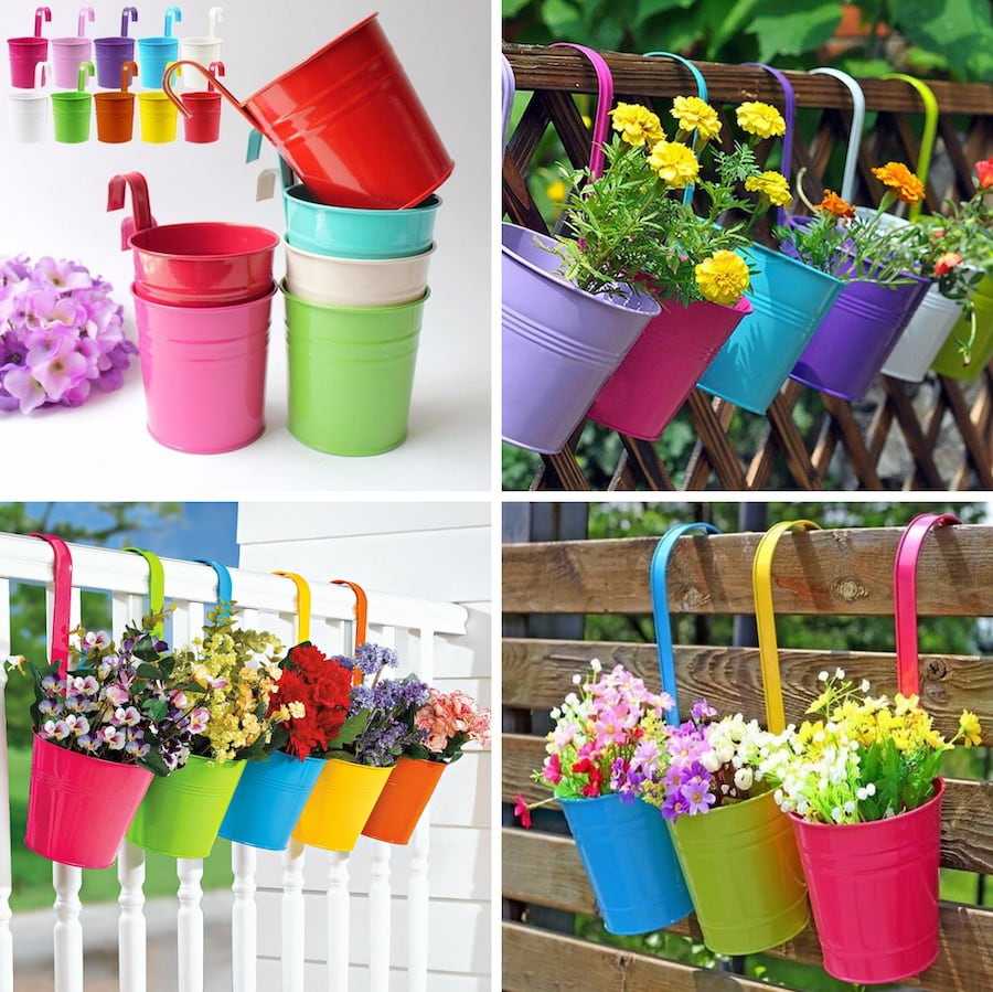Небольшие ведерки из-под майонеза, различные банки украшают бусинами, ракушками или другим декором. Их несложно расписать, покрыв затем лаком. Наполняют почвой и высаживают любимые цветы. Из таких небольших деталей легко собирается вертикальная композиция, украшающая стены беседки, забор.
