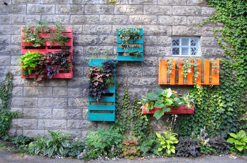 Не менее красиво будет смотреться композиция из поставленных вертикально деревянных поддонов и укрепленных на них горшках с цветами. В результате, вы получите стильную зеленую шпалеру, которая будет эффектно смотреться в вашем саду.
