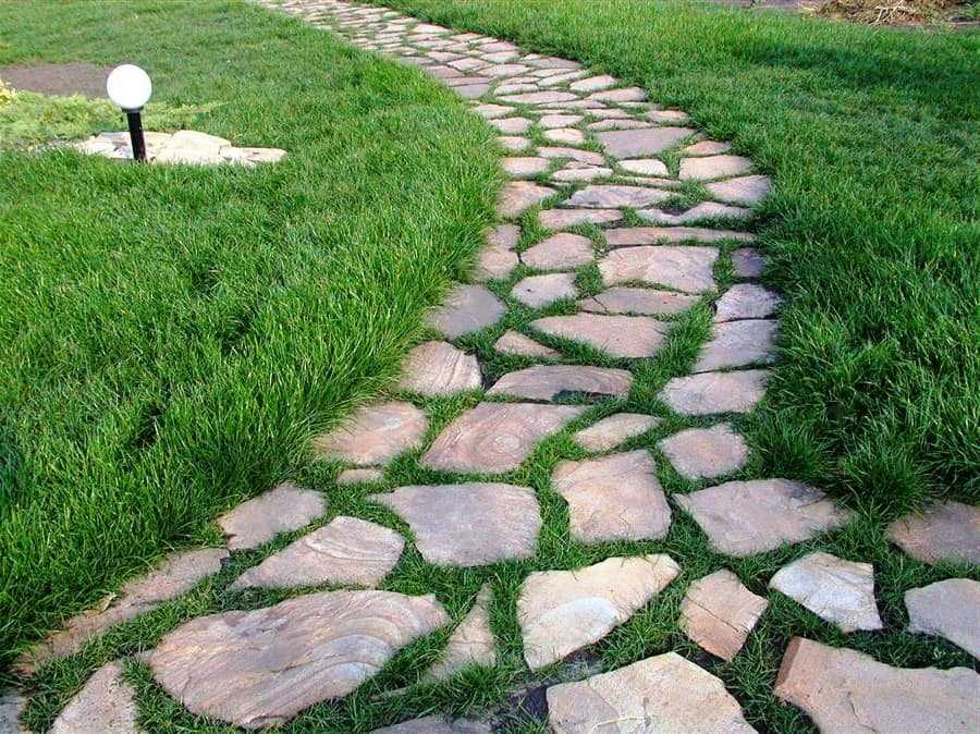 Тропинка из камней, уложенных на газон выглядит не менее эффектно