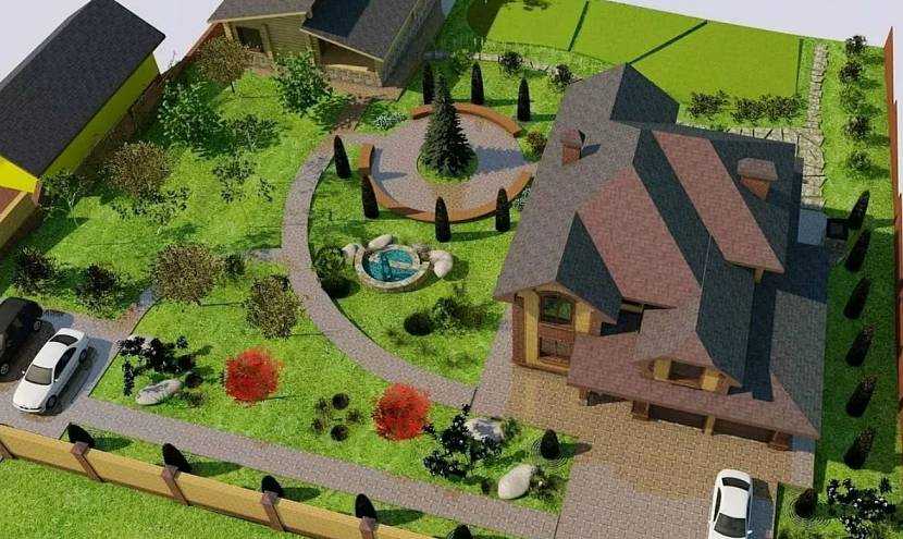 Первая мысль, которая появляется при взгляде на такой участок, — сколько всего здесь можно разместить. Например, небольшой водоем, уютную беседку полукруглой формы с очагом в центре, идеально ровный газон и парковочную площадку на несколько машин. Но в возможностях такой площади кроются и недостатки.
