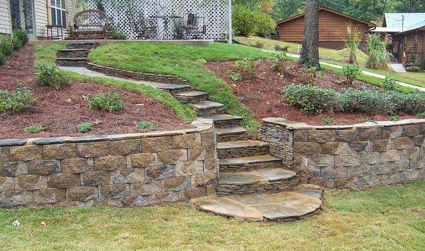 - По углам участка создаются многоярусные клумбы из кирпичей с основой, засыпанной щебнем, альпинарии.