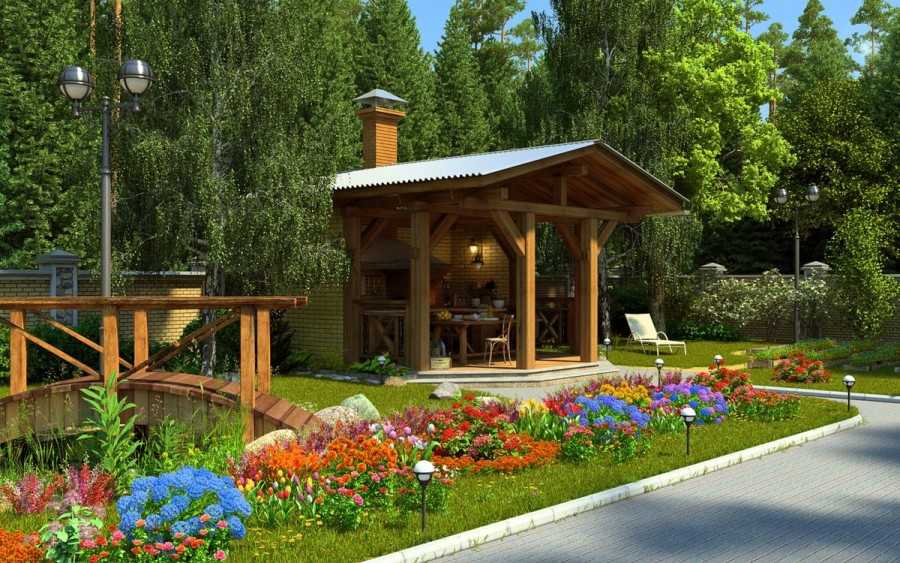 - Зона отдыха. Это террасы, беседки и другие элементы, которые лучше расположить вдали от соседних участков и улицы, но близко к дому.