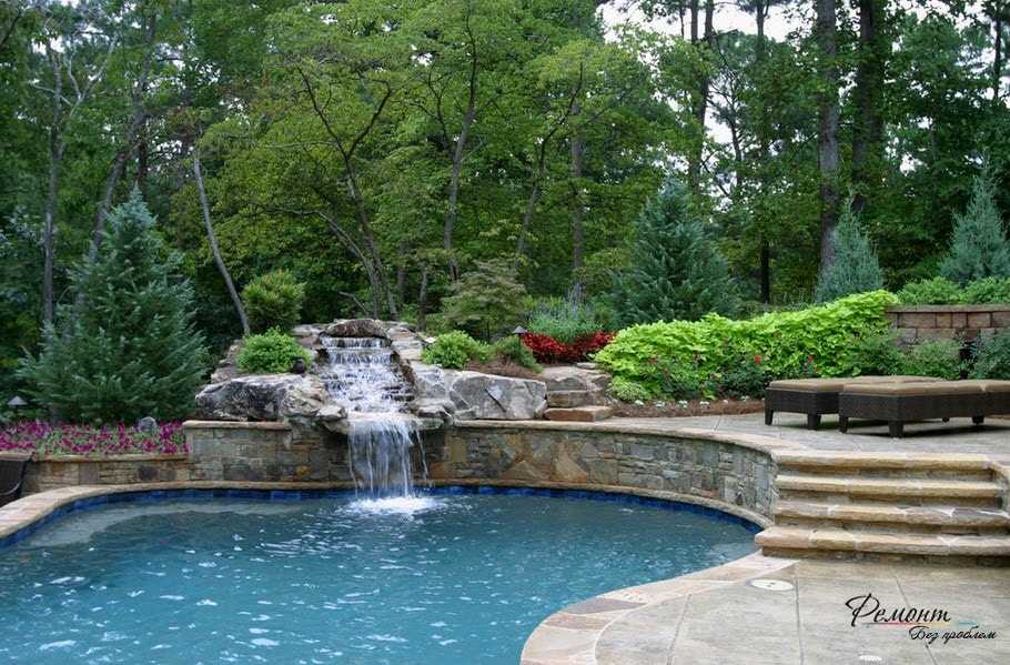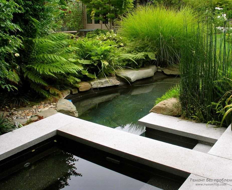 Закрепление берегов бортиками из камней снизит уровень загрязнения. Проект можно обогатить декоративной облицовкой дна, возведением мостиков и островков, установкой дополнительного оборудования для циркуляции и очистки воды, насосов для водопадов и оригинальной подсветки.