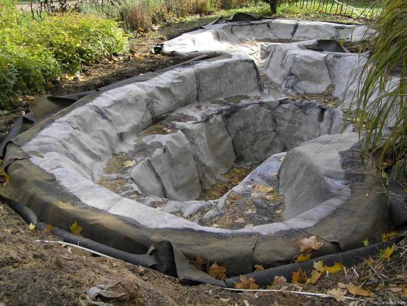 Приобретите пленку для своего водоема с расчетом +0,5 м на стороны по бокам от чаши котлована. Понадобятся еще покупки: геоткань – материал, который укладывают на дно и стены чаши, чтобы защитить пленку от повреждений. Хотя можно использовать что-то из закромов: ненужный ковер, старый линолеум.