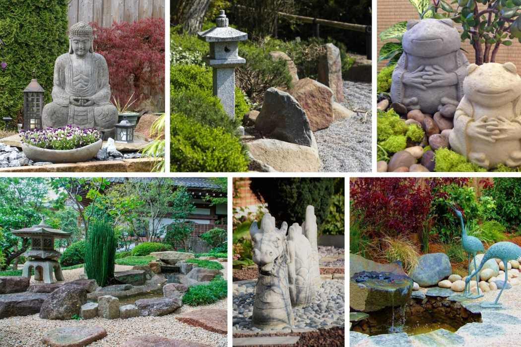 Восточный стиль диктует ограничение в фигурах, поэтому одной крупной статуи Будды, каменного фонаря, журавля или дракона будет достаточно. Ещё это может быть практически любое существо, застывшее в медитации. Японские сады оформляют в духе минимализма, и в них должны преобладать камни, а не фигуры.
