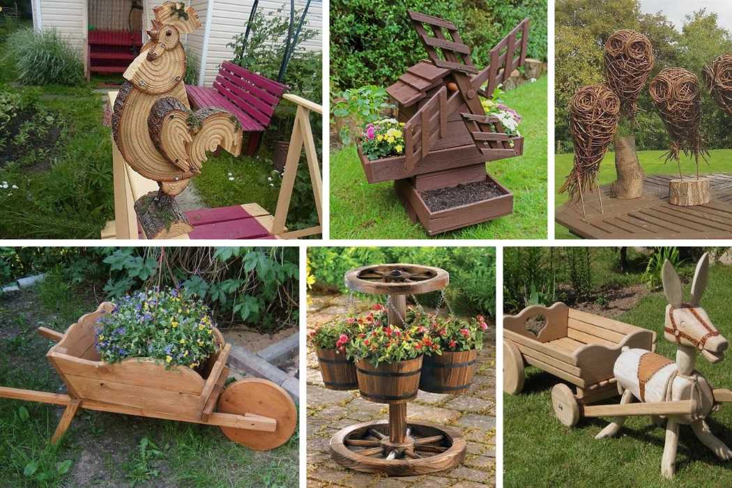 Распространенным материалом для создания садовых скульптур является дерево. Оно подходит для изображения больших и маленьких фигур. Часто этот материал выбирают для того, чтобы изобразить героев из сказок (русских, зарубежных). Для этого применяют сосну, осину, дуб или бук. Чтобы такие произведения как можно дольше сохраняли свой первоначальный вид, их пропитывают защитными составами и покрывают лаком. Иногда в ход пускают обыкновенные коряги, корни деревьев.
