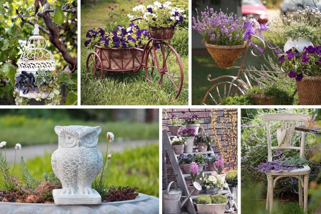 Если у вас дома есть предметы, которые уже давно изжили себя, но выбросить их рука не поднимается, используйте их на даче. Например, старый деревянный стул вместо клумбы. Вытащите сидение, вставьте подходящий по размеру горшок, закрепите его, насыпьте земли и высадите в нее цветущие растения. Интересно получается, когда используются поделки из жестяных банок в декоре.