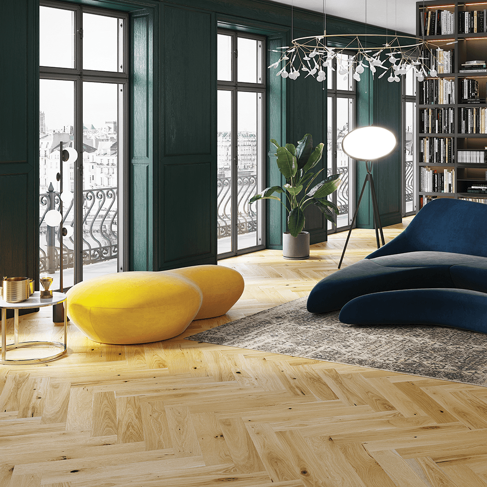 Сочетание зеленого и беленого дуба создаст красивое природное настроение, которое успокоит нервную систему и поможет расслабиться. Для создания контрастного интерьера используйте темно-изумрудную краску для стен, а на полу светлый паркет.